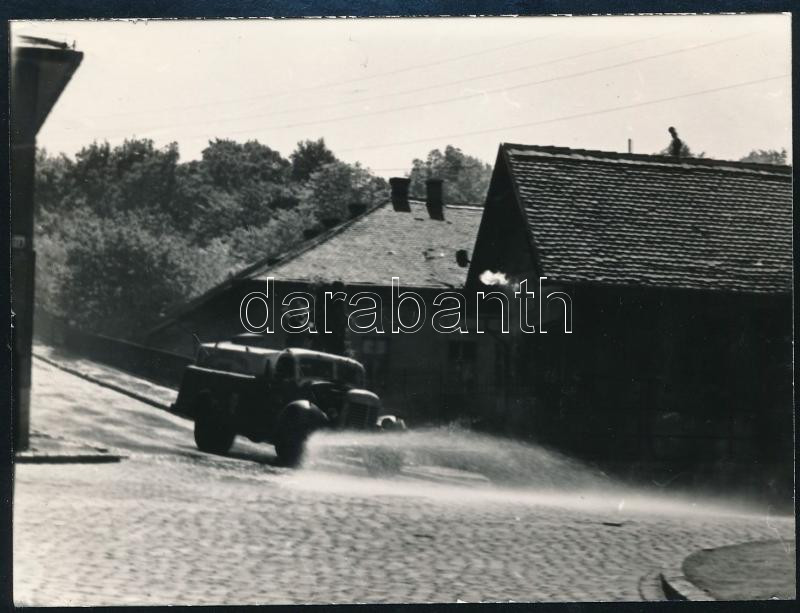 1958 Locsolókocsi egy svábhegyi utcán, hátoldalon feliratozott fotó, 9...