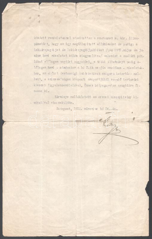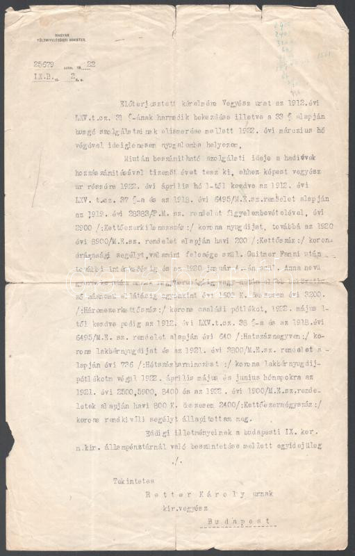Description: 1922 Bp., Mayer János (1871-1955) kisgazda politikus, földmívelésügyi miniszter autográf aláírása nyugdíjazási okiraton. Hajtva, kisebb lapszéli sérülésekkel.