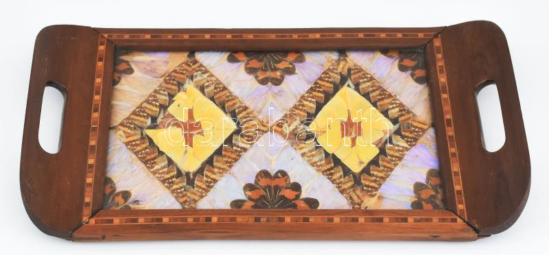 Antik tálca, üveglappal fedett lepkeszárnyakból készült díszítéssel, 42x24 cm