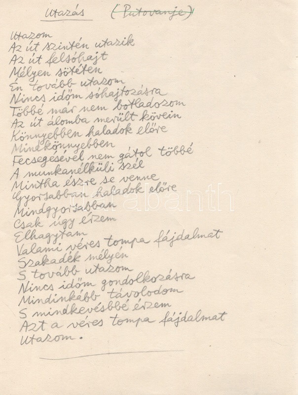 Weöres Sándor (1913-1989) költÅ‘, Ãró ,,Utazás" cÃmű műfordÃtásának saját kézzel, ceruzával Ãrt teljes kézirata. A fordÃtás Vasko Popa (1922-1991) román származású szerb költÅ‘ abszurd költeményérÅ‘l készült. Kelt: [Budapest, 1967]. Egy levél, mérete: 272x210 mm, egy beÃrt oldal. Az egyetlen 25 soros versszakból álló költemény Vasko Popa: Ostromlott derű (Európa Könyvkiadó, 1968.) cÃmű verseskötetének 17-18. oldalán, az azonos cÃmű, hét abszurd költeménybÅ‘l álló, egyszerre népi és szürreális hatásokat mutató ciklus hatodik verseként jelent meg nyomtatásban. A kézirat szövege megegyezik a nyomtatásban megjelentével. Vasko Popa a legtöbbet fordÃtott szerb költÅ‘: 22 idegen nyelven 54 önálló kötete jelent meg. A magyar cÃm mellett az eredeti szerb cÃm (Putovanje) zárójelbe téve és zöld tintával áthúzva. Kifogástalan, jó állapotú lap.