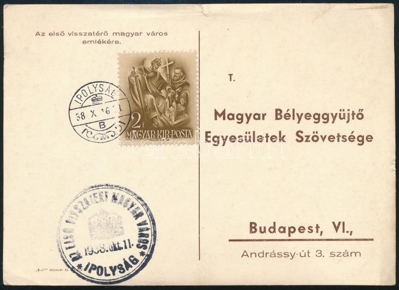 cca 1938 "Magyar Bélyeggyűjtő Egyesületek Szövetsége " levelezőlap, "Ipolyság visszatért" bélyegzéssel.