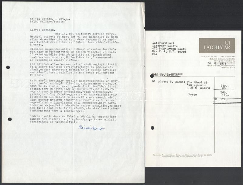 cca 1968 Salerno, Márai Sándor (1900-1989) író gépelt sorai, autográf aláírásával, Molnár József (1918-2009) emigráns magyar író, könyvkiadó, nyomdász, folyóirat szerkesztő, az Aurora Kiadó szerkesztője részére, a "San Gennaro vére" c. regénnyel, és könyvkiadással, valamint a tervezett: Napló 1958-1967 c. könyvével kapcsolatban. "Kedves Barátom" megszólítással, dátum nélkül. +1977 "San Gennaro vére" c. könyvének számlája, az Új Látóhatár fejléces papírján.