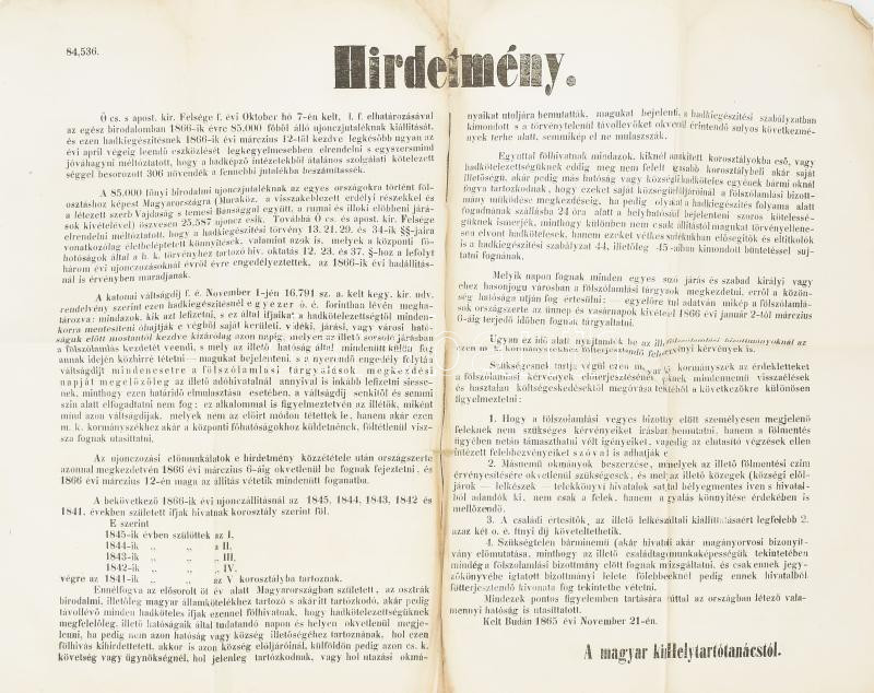 1865 Buda, M. Kir. Helytartótanács által kiadott hirdetmény újoncállít...