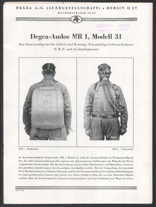 cca 1920 Degea Audos gázmaszk és vegyvédelmi ruha képes katalógus. 8 +...