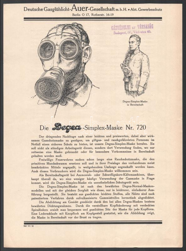 cca 1920 Degea Audos gázmaszk és vegyvédelmi ruha képes katalógus. 8 + 2 p.