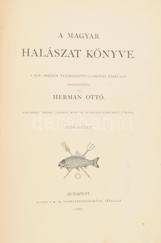 Herman Ottó: A magyar halászat könyve. I-II. kötet. Természettud. Könyvkiadó-Vállalat XXVII-XXVIII. Bp., 1887., Kir. M. Természettudományi Társulat, XV+552 p.+XII t.; 7+556-860+4 p.+IX t. Rendkívül gazdag képanyaggal illusztrált! Átkötött félvászon-kötés, az eredeti papírborítókat a borítókra kasírozták, kissé kopott, foltos borítókkal, az I. kötetben kijáró lapokkal (487-490 p., VI t.; 499-510 p.; VIII-X t.), egy táblán szakadással (VIII t.), egy táblán törésnyommal (XI t.)