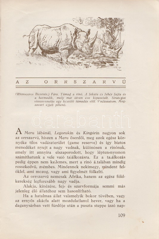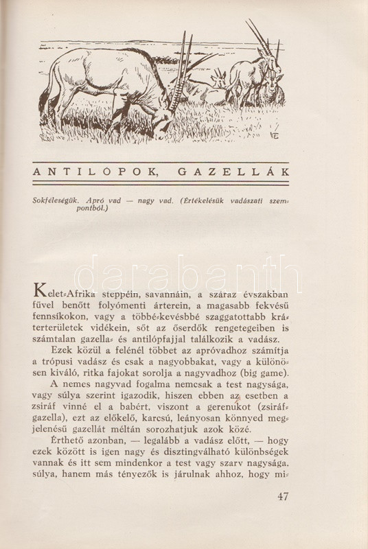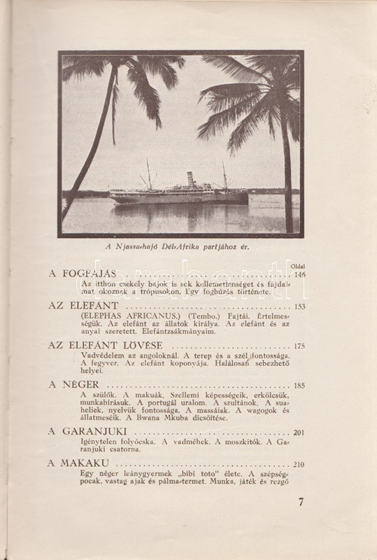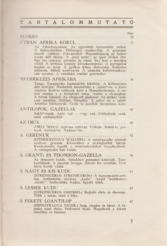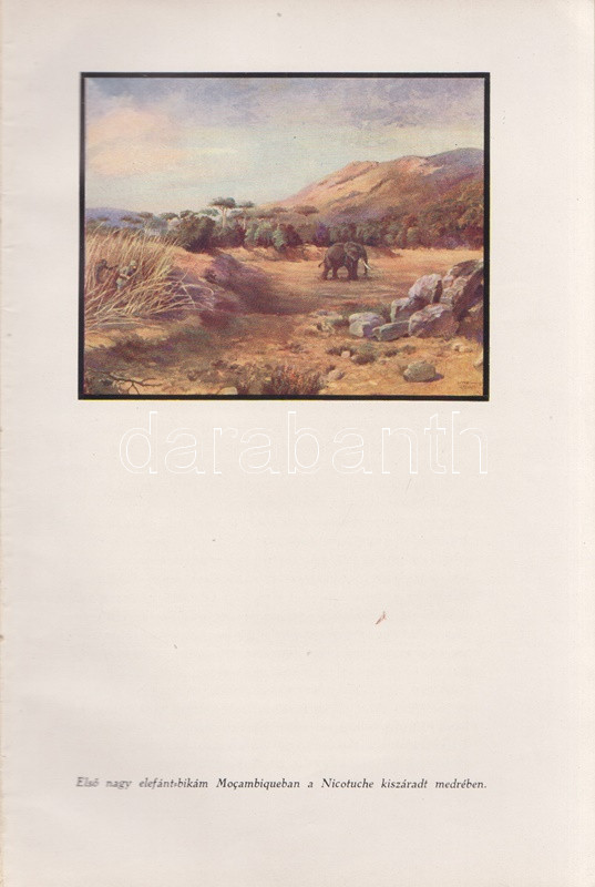Huszár László:,,Kwaheri'', ,,Viszontlátásra" Afrikai vadásznaplójából írta báró Huszár László. Bp., (1929). Királyi Magyar Egyetemi Nyomda. 299 + [1] p. + 8 t. (színes) + térkép (színes, kihajtható térképen Tanganyika térképe). Egyetlen kiadás. Vadászati beszámoló a szerző 1926-1927. évi tanganyikai (volt német-kelet-afrikai) útjáról, a vadászati részleteken kívül a helyi életmód számos, az európai vadász szemszögéből szemlélt részletével. Oldalszámozáson belül gazdag szövegközti fotóanyaggal, a táblákon Vezényi Elemér színes rajzaival. Példányunk első előzékén és első nyomtatott levelének margóján kisebb hiány, a belív egy levelén apró hiány, a színes térképmelléklet sérült, szakadt. Vuray 356. Tordai 607. Színes, illusztrált, enyhén foltos kiadói vászonkötésben.