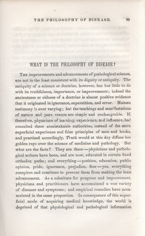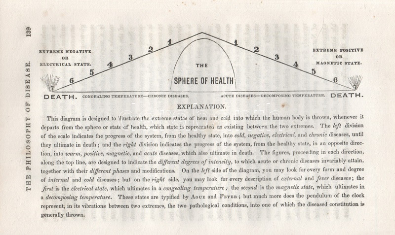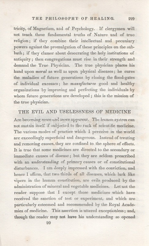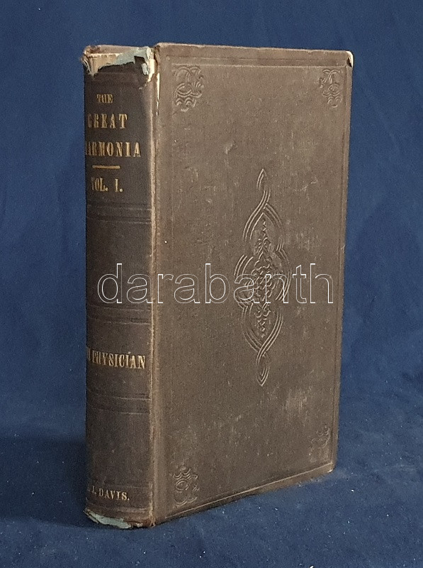 Davis, Andrew Jackson: The Great Harmonia; Being A Philosophical Revelation of the Natural, Spiritual, and Celestial Universe. Volume I: The Physician. Fourth Edition. Boston-New York, [1860 körül]. Benjamin B. Mussey & Co. - J. S. Redfield, Fowlers & Wells (Printed by C. C. Savage, New York). 1 t. (hártyapapírral védett acélmetszetű címképen a szerző portréja) + 456 p. + 1 t. Andrew Jackson Davis (1827-1910) amerikai spiritiszta, látnok. Fiatalkorában előadásokat hallgatott az állati magnetizmus néven ismert eljárásokról, majd látnoki babérokra tört. 1847-től nagyjából harminc könyvet szerzett spiritiszta és okkult témákban, saját bevallása szerint a műveket transzállapotban diktálta írnokának. ,,The Great Harmonia" címen megjelent korai munkája a spiritiszta mozgalom korai szakaszából származik, e hatkötetes nagy mű első, önmagában is megálló, The Physician alcímet viselő első kötete lételméleti és gyógyászati kérdésekkel foglalkozik. Több fejezetben boncolja az ember, az egészség, a betegség, az álom, a halál és a lélektan fogalmait, leghosszabb, művelődéstörténeti szempontból is érdekes fejezete a gyógyászat korabeli problémáit elemzi. Természetgyógyászati elvekből kiindulva hosszasan elemzi a homeopátia és az allopátia, a vízgyógyászat eljárásait, felhívja a figyelmet a természetes étrend, a napfénykúra, a jó levegő, a magnetizmus, az elektromosság és nem utolsósorban a helyesen megválasztott ruházat nyújtotta gyógyhatásokra. A sokat publikáló szerző meglátásainak újszerűségéből sokat levon a tény, hogy számos szerzőt idéz forrásmegjelölés nélkül: a látnok szerző a plágium vádját a művek transzállapotban való születésének - az idézeteket rendre megtaláló kritikusokat kevéssé meggyőző - érvével ütötte el. Mindenképpen érdekes dokumentum az alternatív gyógyászat korai szakaszából, első kiadása 1850-ben jelent meg. Az első előzéken és a belív egy oldalán régi tulajdonosi bejegyzés, a címoldalon dátumozás. Poss.: Gyöngyöshalászy Takách Zoltán [Gyöngyöshalászy Takách Zoltán magyar származású zongoraművész, zongoratanár és zeneszerző. A budapesti Zeneakadémián tanult művész az 1900-as évek első évtizedében magas rangú magyar diplomaták ajánlásával került az amerikai komolyzenei élet sodrába - az amerikai keleti part nagyvárosaiban, New Yorkban, Philadelphiában és az amerikai elit üdülőhelyein lépett fel, egyúttal magán zeneiskolát is fenntartott az Egyesült Államokban.] Aranyozott, enyhén sérült, enyhén hiányos gerincű, vaknyomásos korabeli egészvászon kötésben. Jó példány.