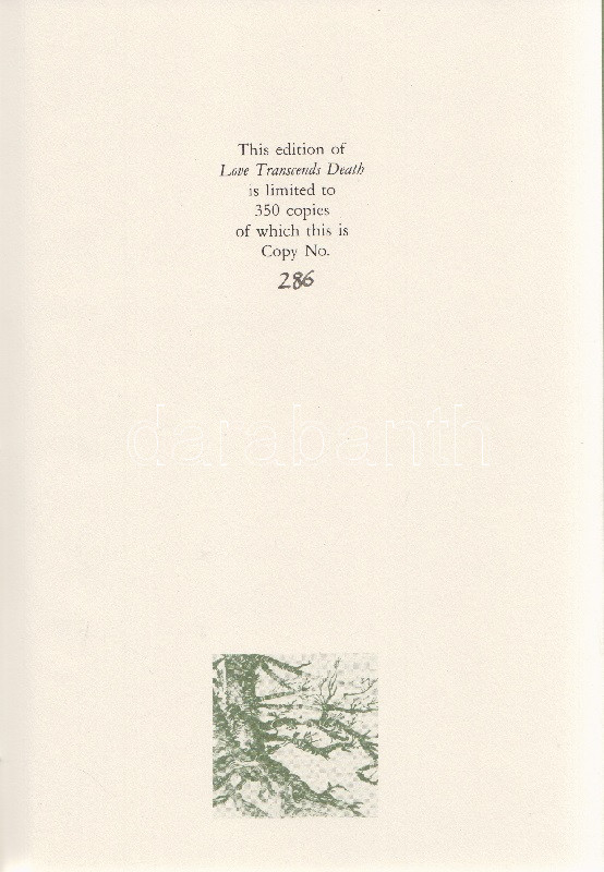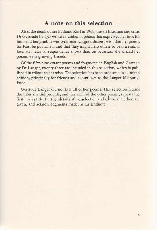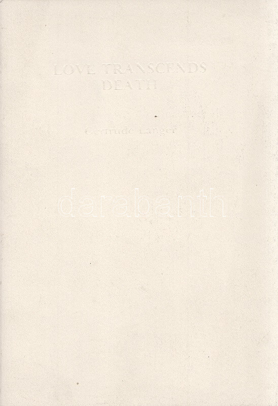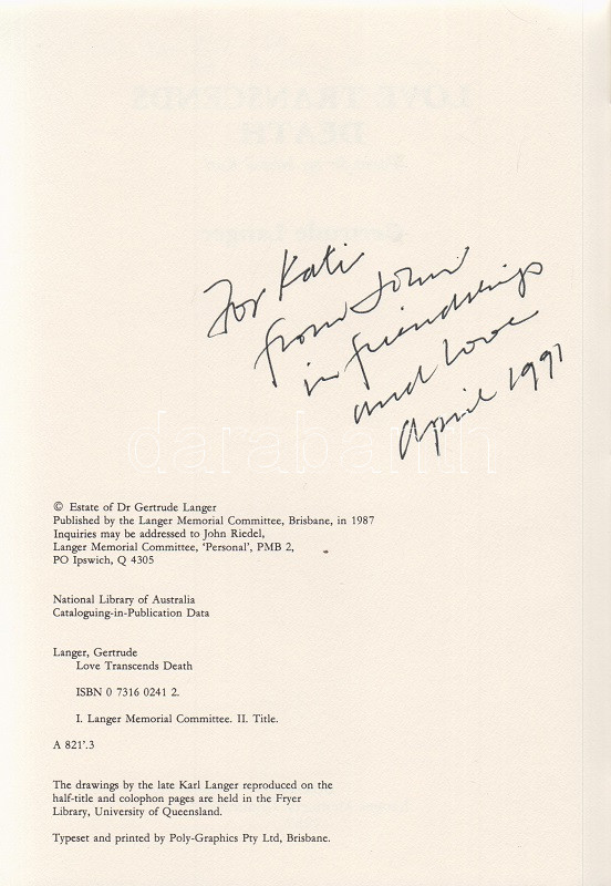 Langer, Gertrude: Love Transcends Death. Poems for my beloved Karl. (Számozott, dedikált.) Brisbane, 1987. Langer Memorian Comittee (Poly-Graphics Pty Ltd.) 29 + [3] p. Egyetlen kiadás. Összesen 350 példányban készült bibliofil kötet számozott példánya. Sorszáma: 286. Dedikált: ,,For Kati from John, in friendship and love. April 1991". Gertrude Langer (született Fröschell) osztrák származású ausztrál művészeti kritikus (1908-1984) posztumusz verseskötete, melyet férje emlékezetének írt. Kötetünk dedikációját a Gertrude Langer-emlékbizottság kurátora, a verseskönyv sajtó alá rendezője, John Riedel írta. A kötet illusztrációi a néhai Karl Langertől, a műkritikus házastársától, neves építésztől valók. Fűzve, dombornyomott kiadói borítóban. Jó példány, ritka.