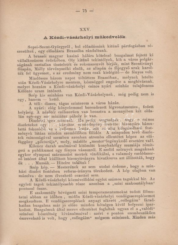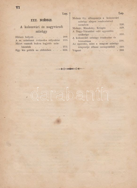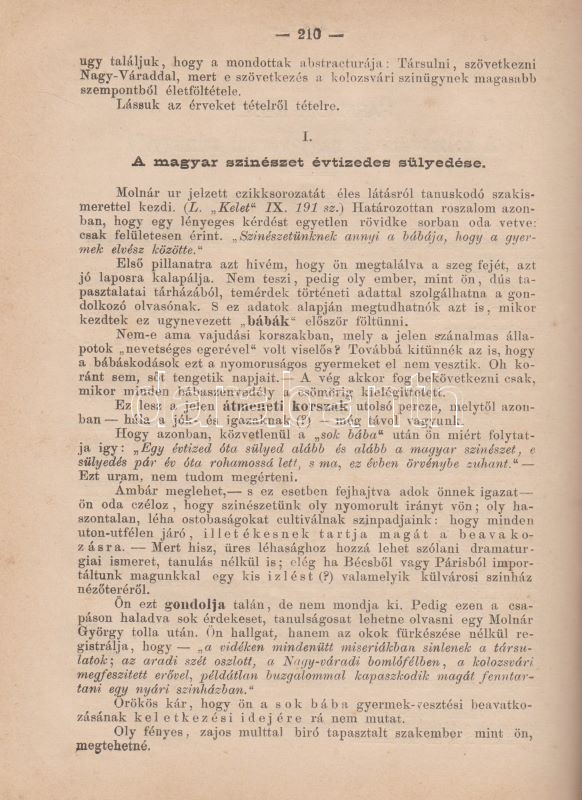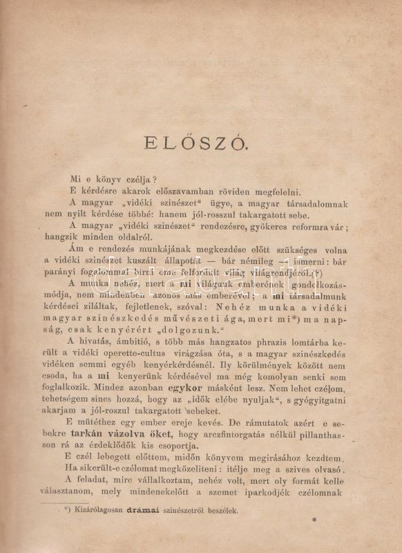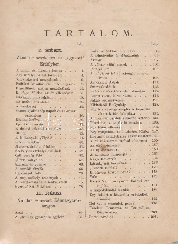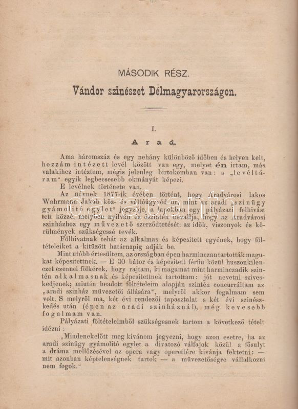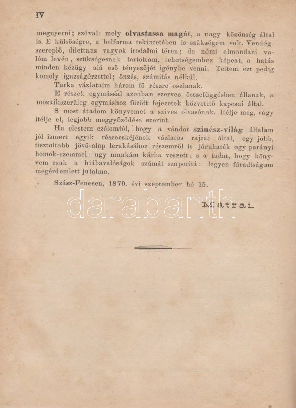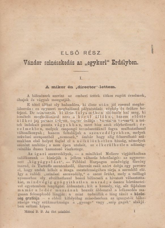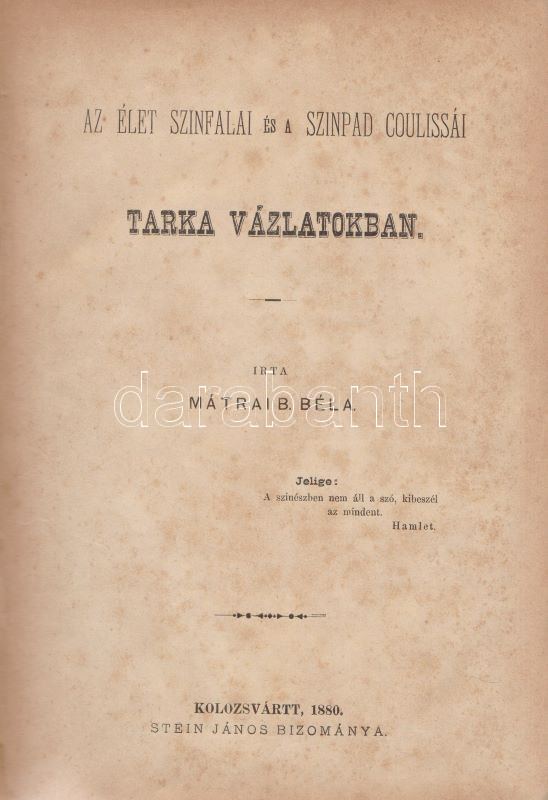 Mátrai B[etegh] Béla: Az élet színfalai és a színpad coulissái tarka vázlatokban. Kolozsvárt, 1880. Stein János bizománya (Stein J. magyar királyi egyetemi nyomdász betűivel). VI + 247 + [1] p. Egyetlen kiadás. Mátrai Betegh Béla (1846-1912) erdélyi színész, társulatvezető, rendező, műfordító. Színháztörténeti munkája nagyja XIX. század második felének vidéki magyar színjátszásainak jellemző történetei közül szemezget. A színidirektori pályát is bejáró szerző tanulmánykötete azonban gazdagabb a puszta anekdota-sorozatnál, a vidéki vándorszínészi társulatok műsorpolitikájának és pénzügyi részleteibe is beavat a munka, valamint kifejti nézeteit a népszínmű-előadások szükségessége mellett: a könnyed és zenés műfaj a színidirektor szerint magyar érzelmeket gerjeszt, és ezért kulcsszerepe van a vegyes kultúrájú városok, főképp Budapest megmagyarosításának folyamatában. Aranyozott, enyhén sérült gerincű korabeli félvászon kötésben, márványmintás festésű lapszélekkel.
