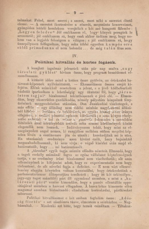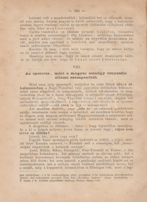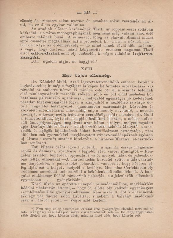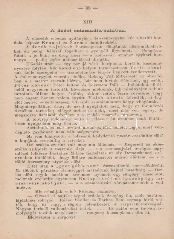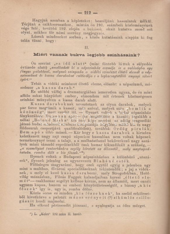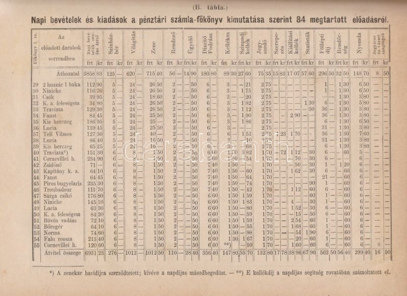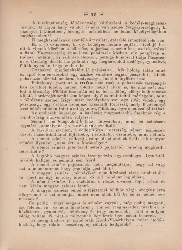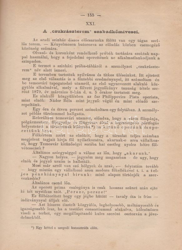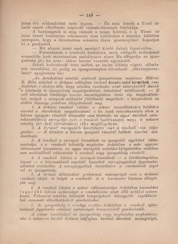 Mátrai B[etegh] Béla: Az élet színfalai és a színpad coulissái tarka vázlatokban. Kolozsvárt, 1880. Stein János bizománya (Stein J. magyar királyi egyetemi nyomdász betűivel). VI + 247 + [1] p. Egyetlen kiadás. Mátrai Betegh Béla (1846-1912) erdélyi színész, társulatvezető, rendező, műfordító. Színháztörténeti munkája nagyja XIX. század második felének vidéki magyar színjátszásainak jellemző történetei közül szemezget. A színidirektori pályát is bejáró szerző tanulmánykötete azonban gazdagabb a puszta anekdota-sorozatnál, a vidéki vándorszínészi társulatok műsorpolitikájának és pénzügyi részleteibe is beavat a munka, valamint kifejti nézeteit a népszínmű-előadások szükségessége mellett: a könnyed és zenés műfaj a színidirektor szerint magyar érzelmeket gerjeszt, és ezért kulcsszerepe van a vegyes kultúrájú városok, főképp Budapest megmagyarosításának folyamatában. Aranyozott, enyhén sérült gerincű korabeli félvászon kötésben, márványmintás festésű lapszélekkel.