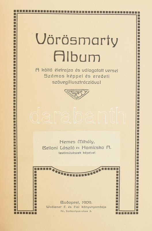 Vörösmarty Album. A költő életrajza és válogatott versei. Számos képpel és eredeti szövegillusztrációval. Szerk.: Salusinszky Imre. Műmellékletek nélküli, népszerű kiadás. Bp.,1909, Wodianer F. és Fiai. 240 p.+ 6 t. A lapok tetején szecessziós könyvillusztrációkkal. Nemes Mihály, Belloni László, és Homicsko A. egészoldalas illusztrációival. Kiadói aranyozott, dombornyomott díszítésű egészvászon-kötés, Gottermayer-kötés, kopott borítóval.
