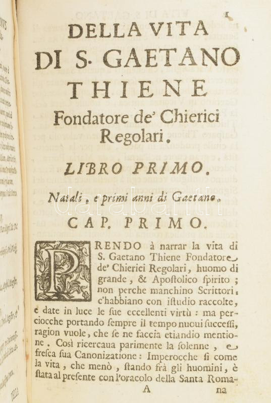 Giuseppe Silos: Vita Dis Gaetano Thiene Fondatore della Religione de' Chierici Regolari, descritta da D. Giuseppe Silos Bitontino della medesima religione. Dedicata all'illustrissima signora contessa D. Helena Visconti Borromea. Milano, 1671, Appresso Lodovico Monza, 8+368 p. Olasz nyelven. Korabeli egészpergamen-kötésben, kopott, foltos borítóval, a címlapon és az elülső kötéstábla belsején bejegyzésekkel, néhány kissé foltos lappal.