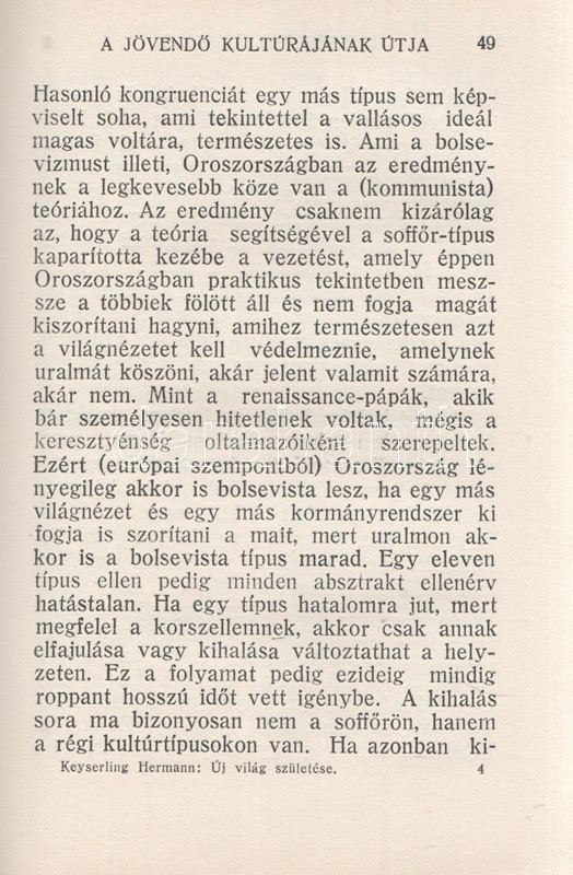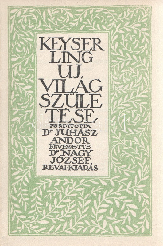 Keyserling, Hermann von: Új világ születése. Fordította Juhász Andor. Bevezette Nagy József. [Budapest, 1929]. Révai Irodalmi Intézet Rt. (ny.) [4] + 194 + [6] p. Első magyar kiadás. Hermann Kayerling (1880-1946) balti német filozófus, a darmstadti ,,Gesellschaft für Freie Philosophie" alapítója. Műve eredeti nyelven először 1926-ban jelent meg, ,,Die neuentstehende Welt" címen. A livóniai szülőföldjét a szovjet fordulat miatt elhagyni kényszerülő Kayserling történelemfilozófiai munkája Oswald Spengler filozótus felvetéseire reagál, és elemzi a kultúra fennmaradásának esélyeit a tömegember korában (melyet ő sofőrtípusnak nevez). A könyv címoldalát Zádor István grafikusművész rajzolta. A kötet szerepel az Ideiglenes Nemzeti Kormány által 1945-ben betiltott könyvek jegyzékén. (Világkönyvtár, 50. kötet.) Illusztrált, feliratozott, vaknyomásos kiadói egészvászon kötésben. Jó példány.