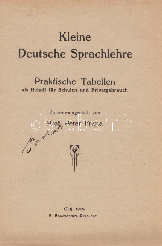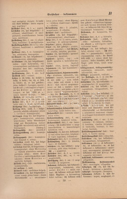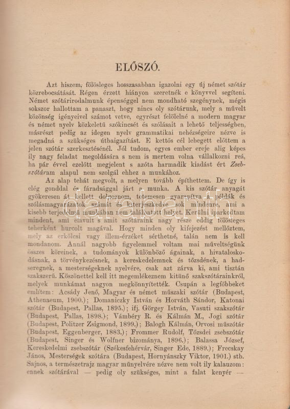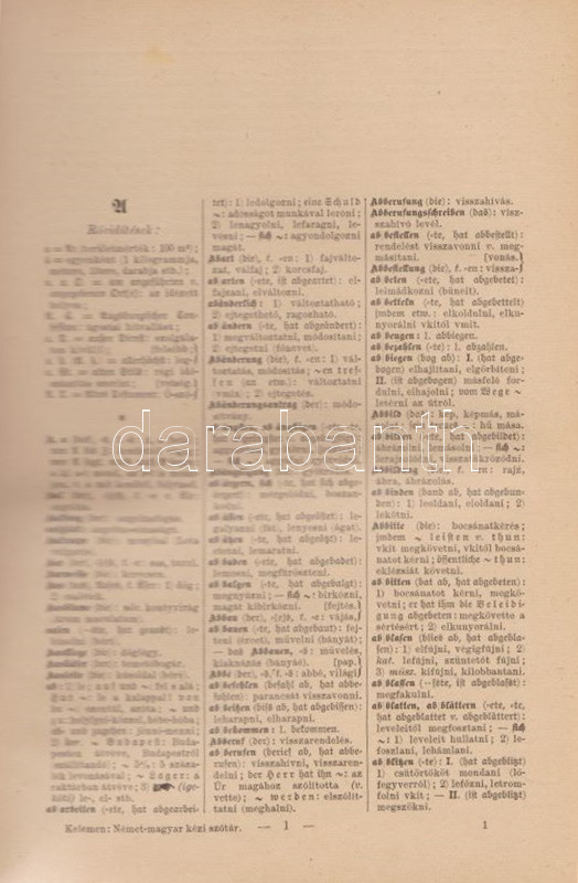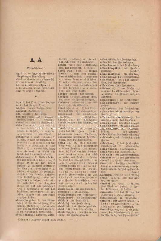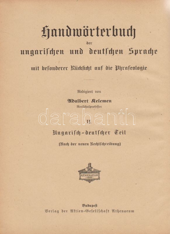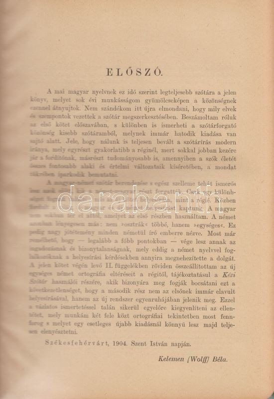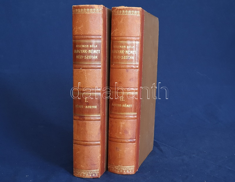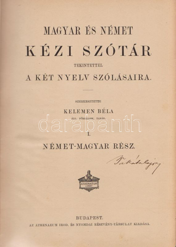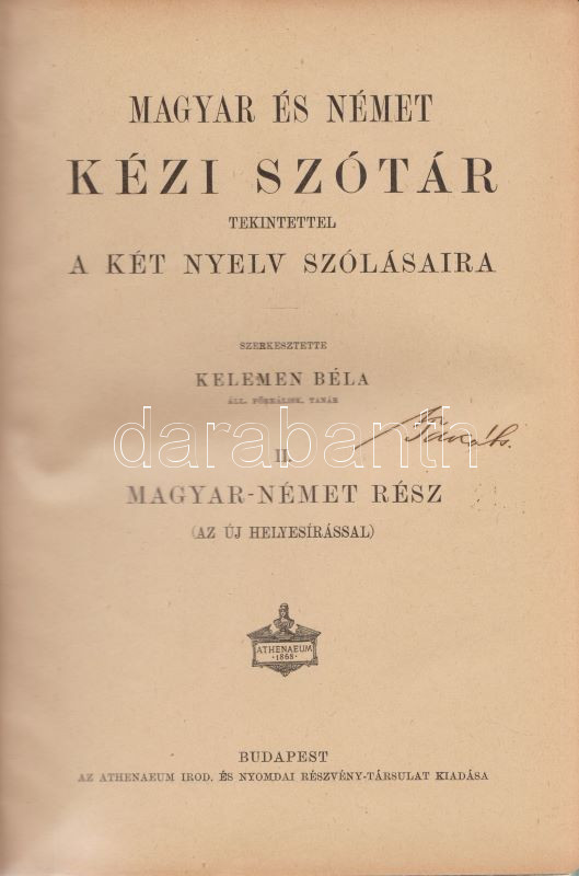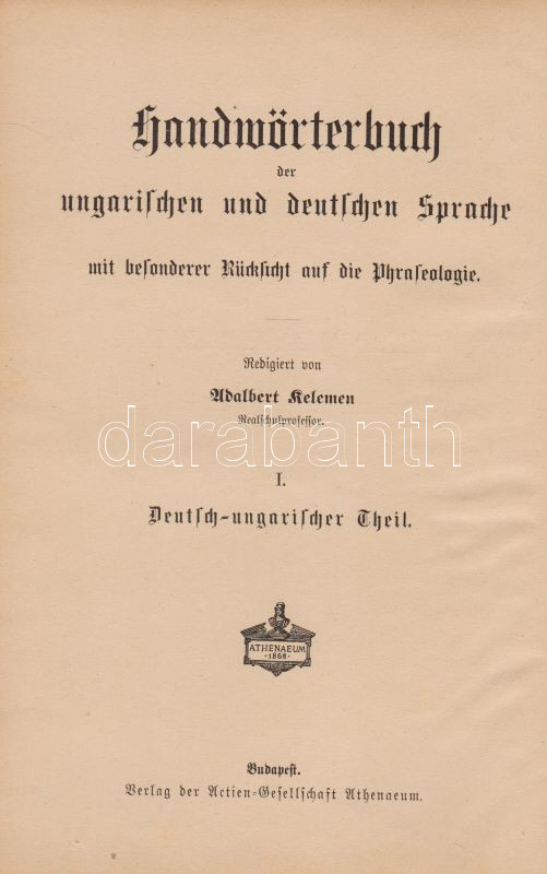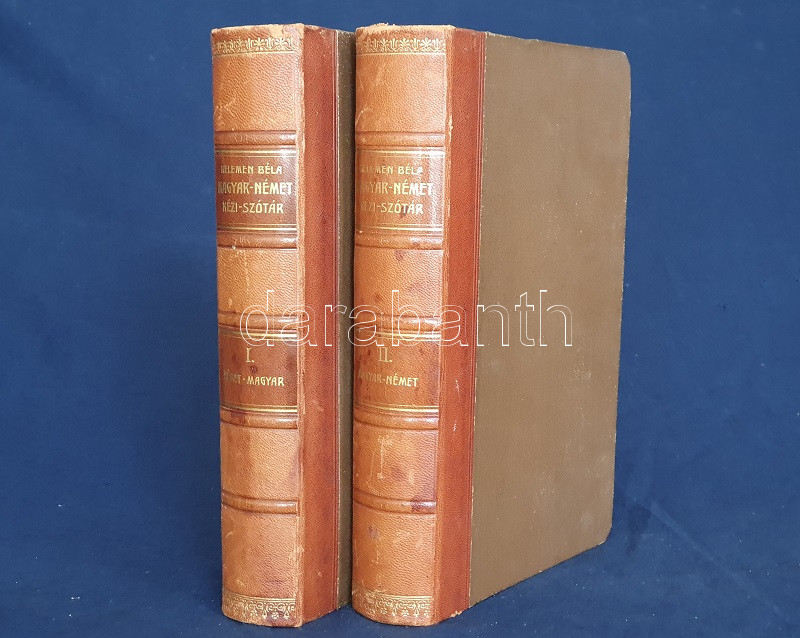 Magyar és német kézi szótár, tekintettel a két nyelv szólásaira. Szerkesztette Kelemen Béla. I. Német-magyar rész. II. Magyar-német rész. [Teljes mű, két kötetben.] (Handwörterbuch der ungarischen und deutschen Sprache mit besonderer Rücksicht auf die Phraseologie Theil I-II.) Budapest, (1901-1904). Athenaeum Irodalmi és Nyomdai Rt. VIII + 512 p. [8] + 528 p. Három hasábra tördelt szövegoldalakkal, a német nyelvű részek fraktúr betűkkel nyomva. A címoldalakon régi tulajdonosi bejegyzés. A kötetben elhelyezve a Peter Frana által írt ,,Kleine Deutsche Sprachlehre" című, 16 oldal terjedelmű nyelvtani összefoglaló füzet (Kolozsvár, 1925), címoldalán tulajdonosi bejegyzéssel. Egységes, aranyozott gerincű, álbordázott korabeli félbőr kötésben. Szép példány.