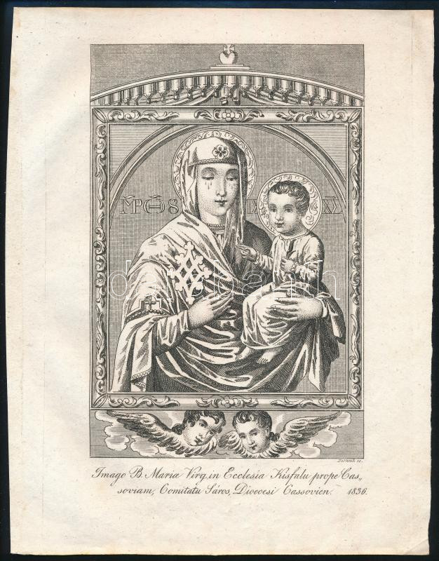 1836 Dorneck, Joseph (működött Bécsben, az 1820-1830-as években): A tótkisfalusi Mária-kegykép, a máriapócsi ikon másolata (Imago B. Mariae Virg. in Ecclesia Kisfalu prope Cassoviam, Comitatu Sáros, Dioecesi Cassovien). Rézmetszet, papír, jelzett a metszeten, 18x11 cm. [In: Jordánszky Elek: Magyar országban 's az ahoz tartozó részekben lévő Bóldogságos Szűz Mária kegyelem' képeinek rövid leírása. Pozsony, 1836.]
