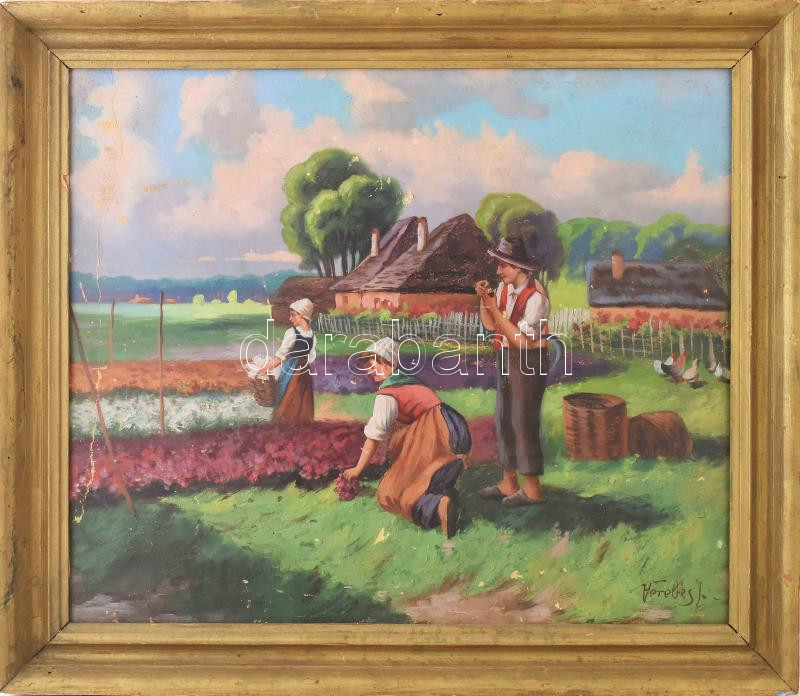 Verebes jelzéssel: Kerti munka. Olaj, karton. Sérült. Fakeretben. 52x6...