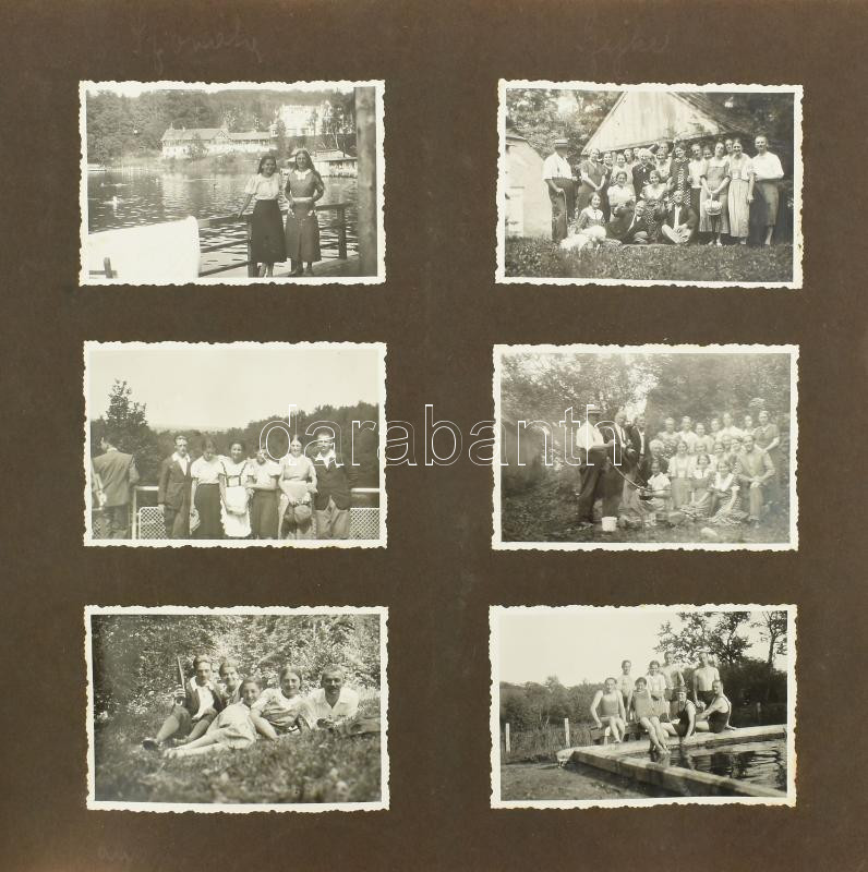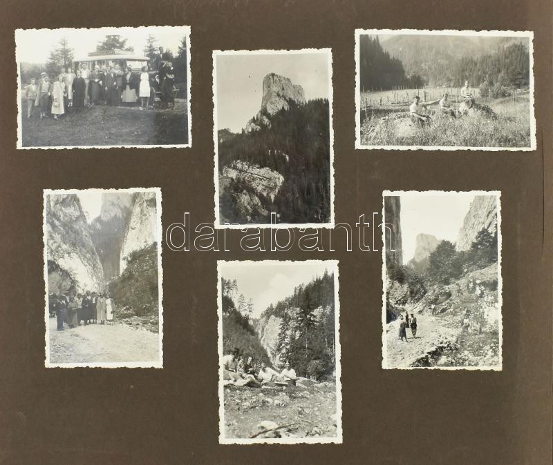 1935-1937 Családi fotóalbum, benne utazási képek (közte Erdély, Békás-szoros, Oltár-kő; Fertőrákosi kőfejtő, stb.); katonatisztet ábrázoló fotók, hölgy katonai egyenruhában; egyéb vegyes családi képek. Összesen kb. 150 db fotóval, albumlapokra beragasztva. Korabeli zsinórfűzéses, egészvászon-borítású albumban, kopott borítóval, egy lapon kivágásból eredő hiánnyal.