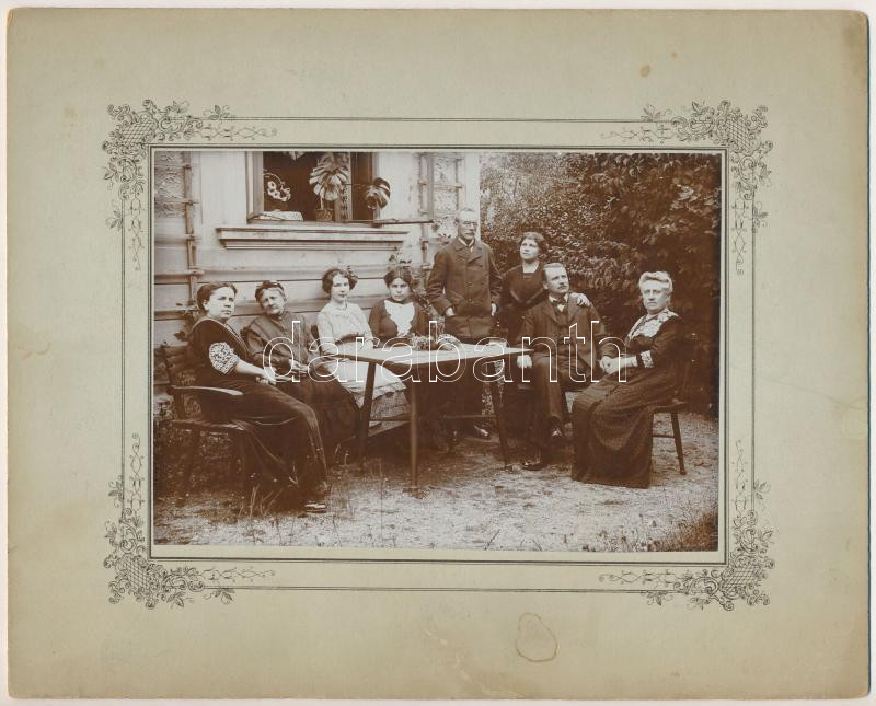 cca 1900 Családi fotózkodás a kertben, 1 db vintage fotó, jelzés nélkül, 11,5x16 cm, karton 20x24,7 cm