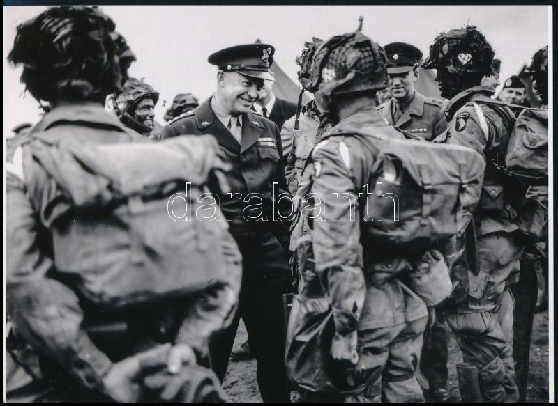 Description: cca 1944 június 5. David Eisenhower (1890-1969) amerikai tábornok (később az USA elnöke) katonái körében, a D-napi bevetés előtt, hírügynökségi felvétel modern nagyítása, jelzés nélkül, 15x21 cm