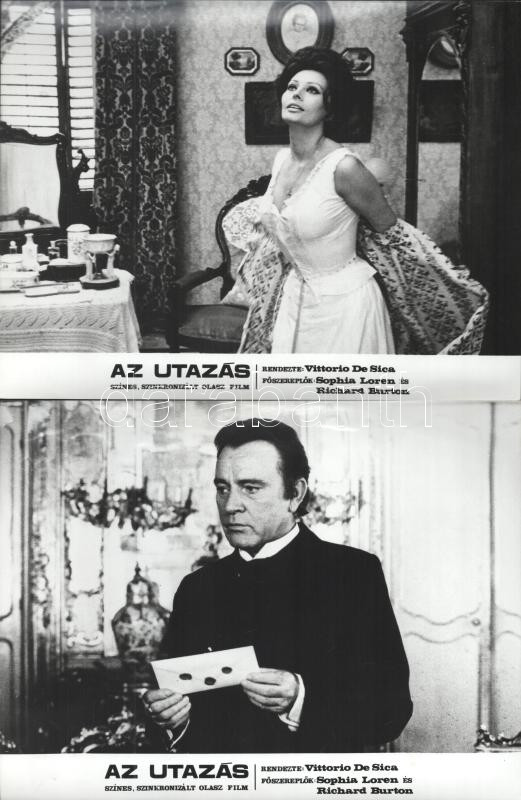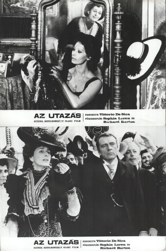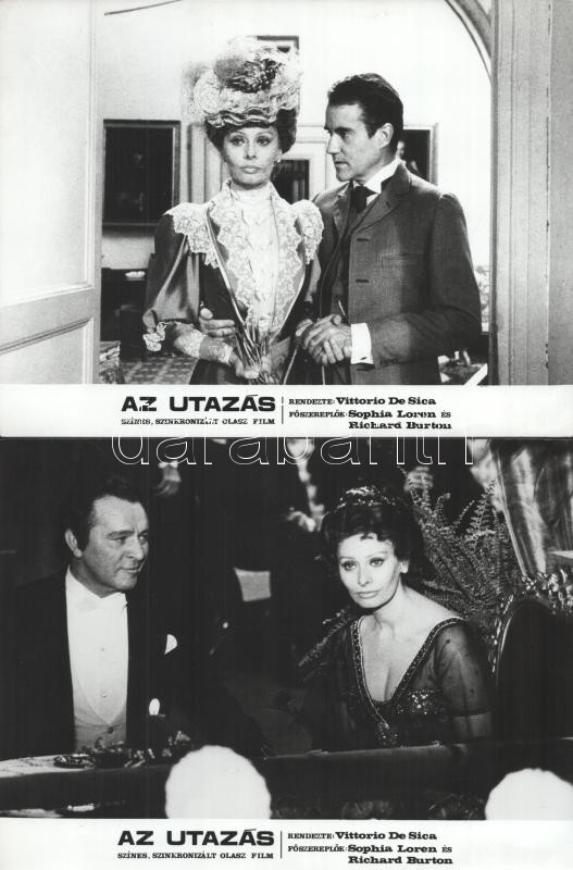 Description: cca 1989 előtt készült ,,Az utazás" című olasz film jelenetei és szereplői (köztük Sophia Loren és Richard Burton), 13 db vintage produkciós filmfotó (vitrinfotó, lobbyfotó) ezüst zselatinos fotópapíron, a használatból eredő (esetleges) kisebb hibákkal, 18x24 cm