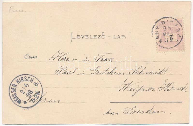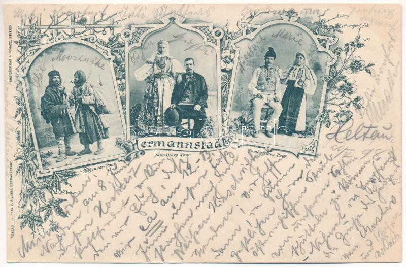 Description: 1898 (Vorläufer) Nagyszeben, Hermannstadt, Sibiu; Cigány, erdélyi szász és román pár népviseletben. Carl F. Jickeli kiadása / Gypsy, Transylvanian Saxon and Romanian couples, folklore. Art Nouveau, floral (vágott / cut)