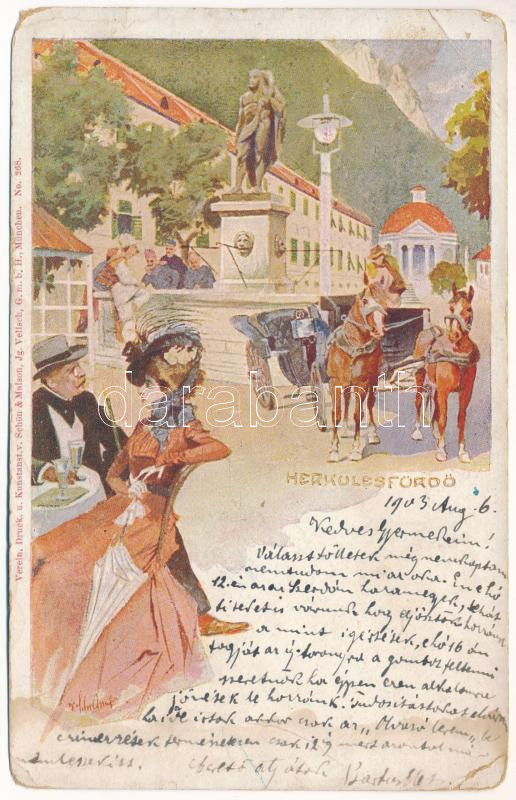 Description: 1903 Herkulesfürdő, Baile Herculane; Szecessziós művészlap fürdővendégekkel / spa guests. Kunstanstalt v. Schön & Maison Nr. 172. Art Nouveau, artist signed (EM)