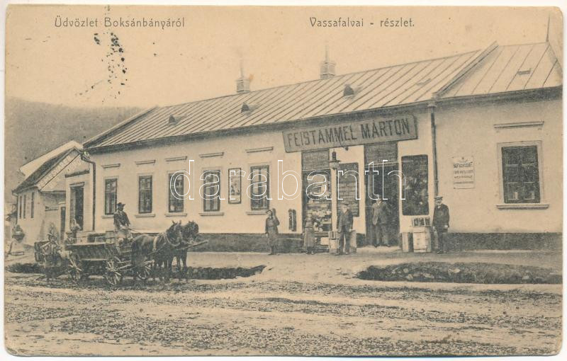 1911 Boksánbánya, Románbogsán, Németbogsán, Deutsch-Bogsan, Bocsa Montana; Vassafalvai (Vasziova) részlet, Feistammel Márton üzlete / Vasiova, shop of Feistammel (r)