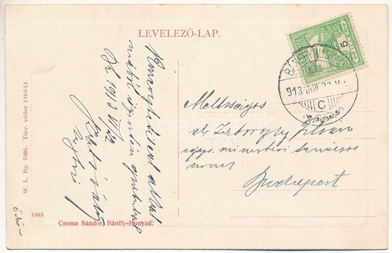 1913 Bánffyhunyad, Huedin; Községháza, Müller Sándor asztalos, Diamantstein Nándor könyvnyomdája. W.L. Bp. 7086. 1910-13. 1095., Csoma Sándor kiadása / town hall, shops