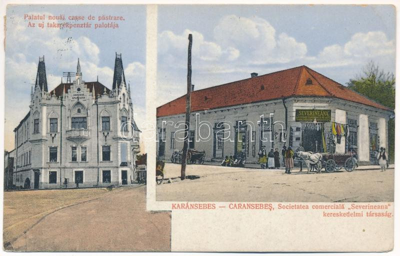 Description: 1917 Karánsebes, Caransebes; Palatul nouai casse de pastrare, Societatea comerciala "Severineana" / Az új takarékpénztár palotája, Severineana kereskedelmi társaság üzlete / palace of savings bank, shop