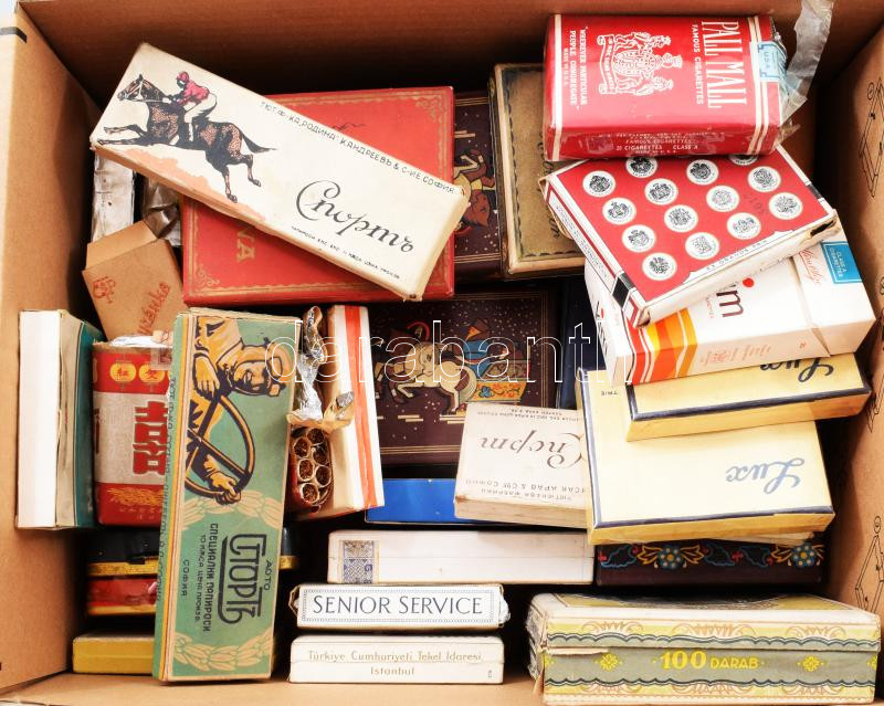 45 doboz régi cigaretta, szivar, sok közte teljes illetve bontatlan, kiemelkedő darabokkal. Budavár, Luxus, Femina, Lady, Stambul, Coronitas, Amneris osztrák 1937-es cigaretta, Rhodopeon, orosz cigaretták, Lux, Caravan, Memphis, Goldflake, Senior Service, Yaset, Pall Mall, Kim, Gitanes. Szép gyűjtemény!