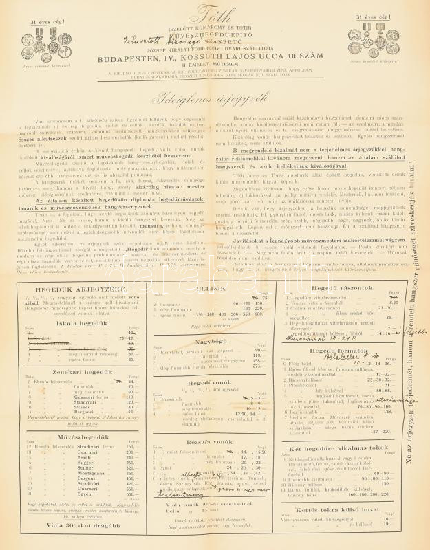 cca 1930 Tóth (ezelőtt Komáromy és Tóth) művészhegedű-építő árjegyzéke, hajtott, 50×35 cm