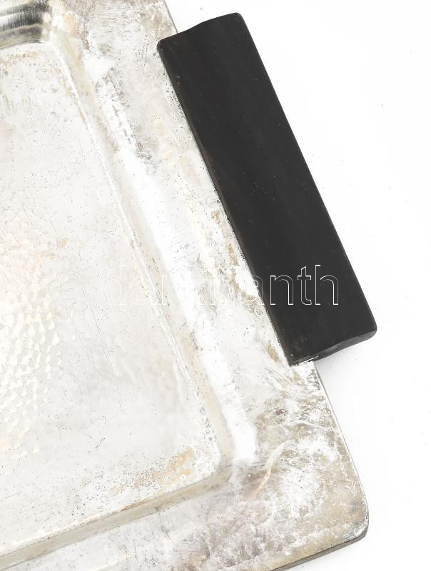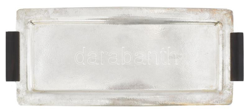 Art deco tálca. Ezüstözött fém, rózsafa fogókkal, jelzett 49x21 cm