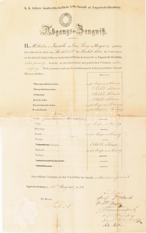 1854 Kézdi-Kovács Vilmos, Kézdi-Kovács László (1864-1942) festőművész, újságíró, a Pesti Hírlap műkritikusa apjának magyaróvári mezőgazdasági felsőiskola bizonyítványa, többek közt Pabst Henrik Vilmos (1798-1868) igazgató, Müller Ágoston Ernő (1819-) és más tanárok autográf aláírásaival, német nyelven, papírfelzettel, javított szakadásokkal.