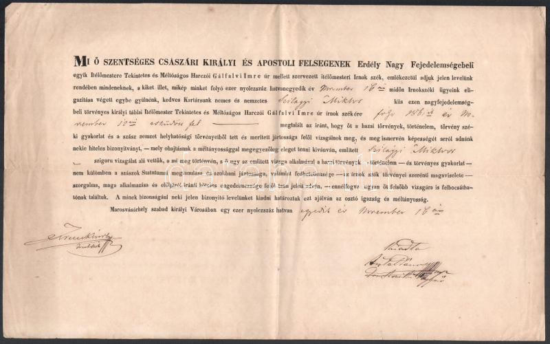 1861 Marosvásárhelyi ítélőmesteri képesítő okirat