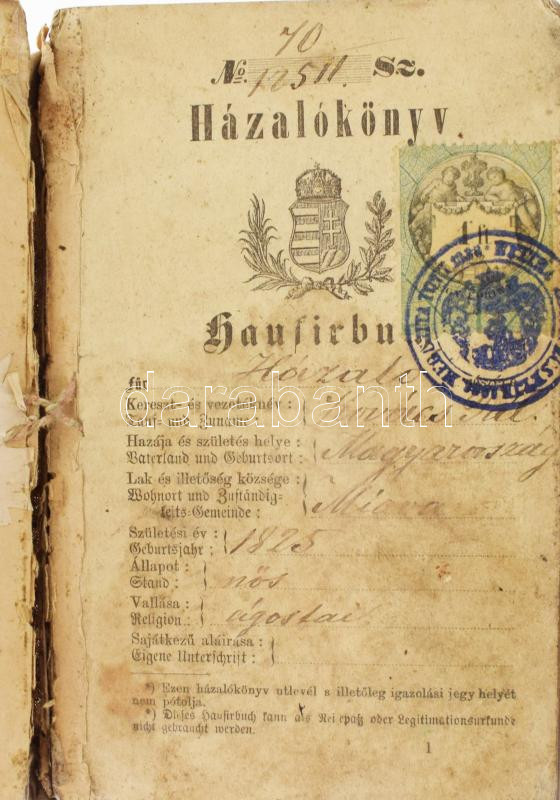 https://www.darabanth.com/en/468-Online-auction/468.0/Art-and-other-collectibles/Documents~1000021/1876-Hazalokonyv-1Ft-illetekbelyeggel-vaszon-kelme-arus-reszere-nagyon-sok-helyiseg-pecsettel~II3164744