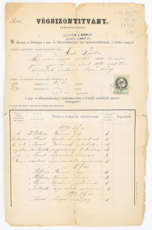 1876 Végbizonyítvány a Királyi Magyar Tudomány-egyetem jog- és államtu...