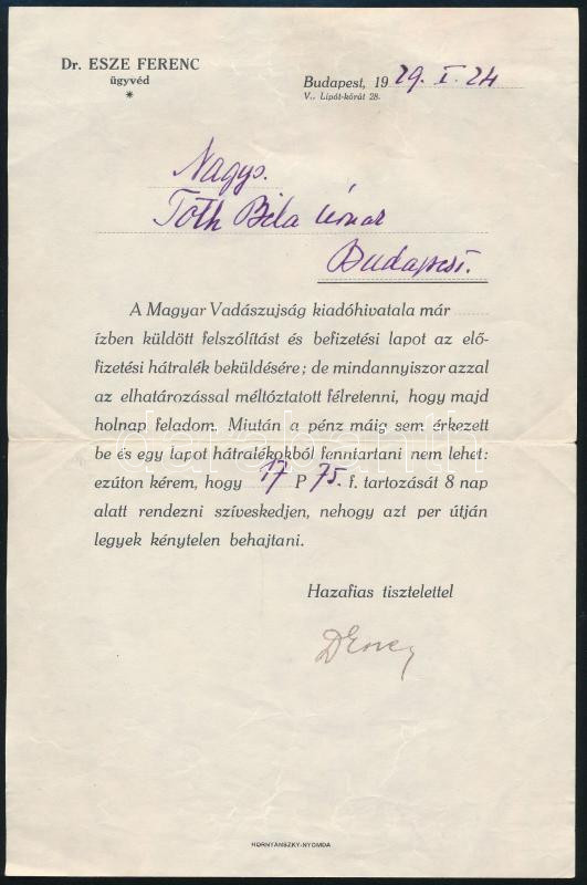 1929 Bp., Dr. Esze Ferenc ügyvéd aláírt felszólítása a Magyar vadászúj...