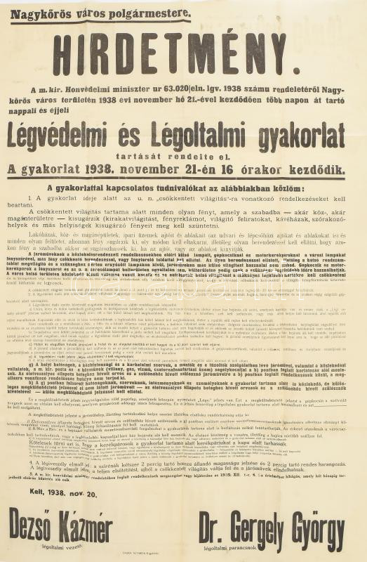 1938 Nagykőrös légoltalmi és légvédelmi gyakorlat nagy plakát 60x90 cm