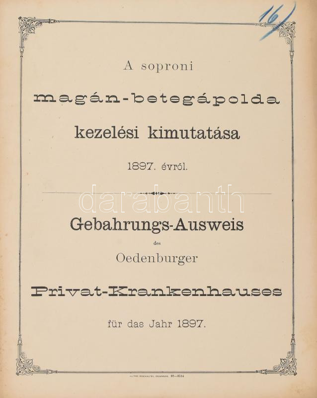 1898 A soproni magán-betegápolda kezelési kimutatása 1897. évről. Sopr... https://www.darabanth.com/en/468-Online-auction/468.0/Art-and-other-collectibles/Printed-Materials~2000104/1898-A-soproni-magan-betegapolda-kezelesi-kimutatasa-1897-evrol-Sopron-1898-Romwalter~II3166076