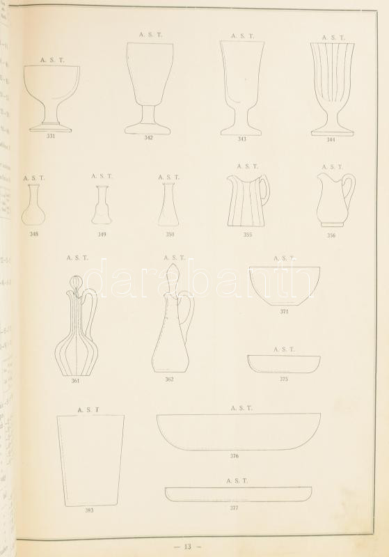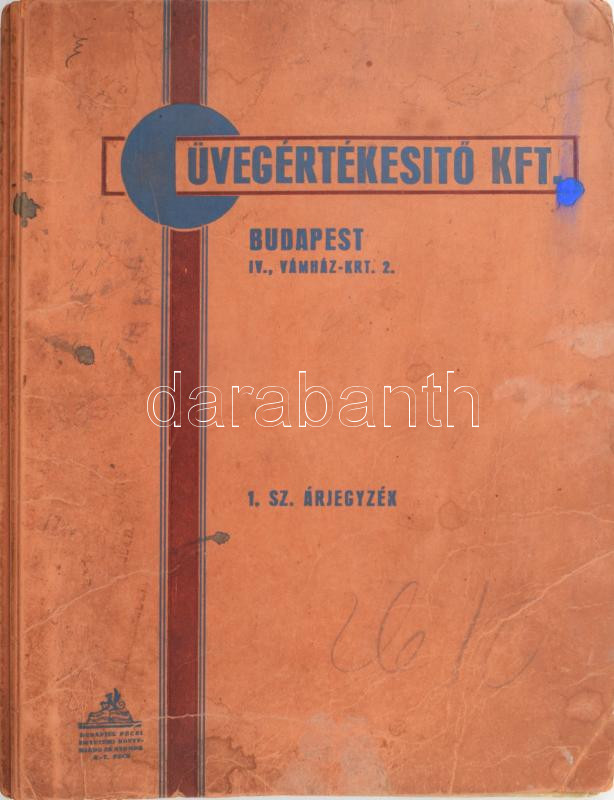 1939 Üvegértékesítő Kft. Budapest IV., Vámház-krt. 2. 1. számú árjegyzéke. Üvegértékesítő KFT Kossuch János Ajkai Üveggyárának, Salgótarjáni Üveggyár Rt-nak, Salgótarján és a Tokodi Üveggyár Rt-nak, központi eladási irodája. Pécs, Dunántúl Pécsi Egyetemi-ny., gazdag képanyaggal illusztrált, magyar és német nyelven, bejegyzésekkel, kissé foltos lapokkal és foltos borítóval.