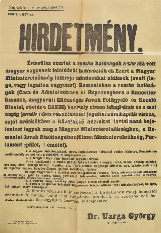 1946 Nagykőrös hirdetmény a román hatóság által lefoglalt vagyonok zár... https://www.darabanth.com/en/468-Online-auction/468.0/Art-and-other-collectibles/Printed-Materials~2000104/1946-Nagykoros-hirdetmeny-a-roman-hatosag-altal-lefoglalt-vagyonok-zar-alol-feloldasanak~II3159428