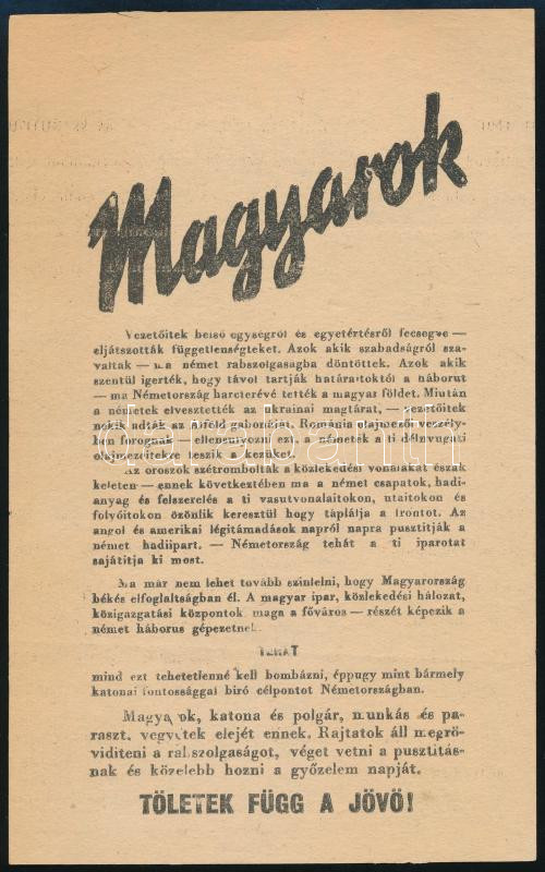 cca 1942-44 "Magyarok", II. világháborús, szövetséges, kétoldalas propaganda röplap, szövetséges repülő által terjesztve