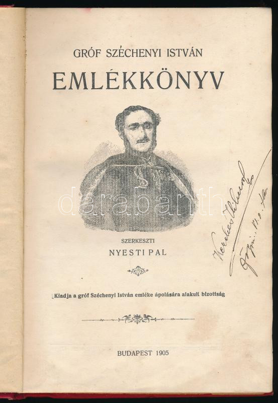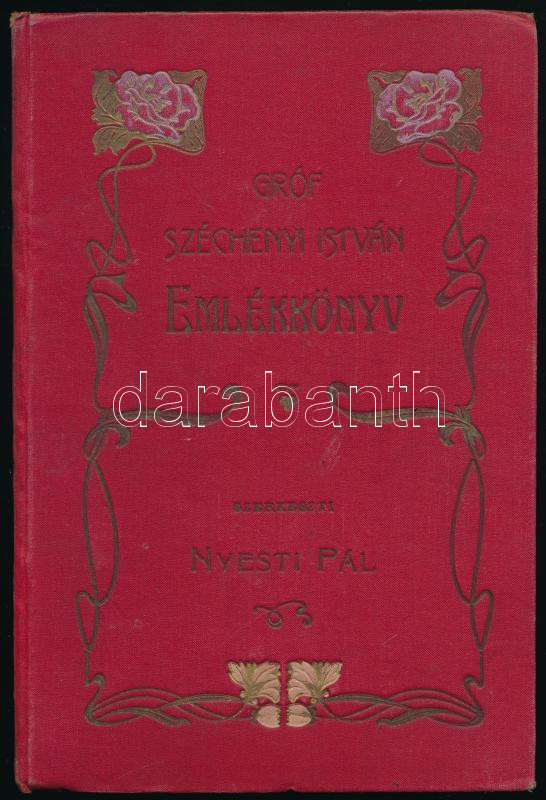 Gróf Széchenyi István emlékkönyv. Szerk.: Nyesti Pál. Bp., 1905, gróf Széchenyi István emléke ápolására alakult bizottság ("Otthon"-ny.), 131+(5) p. Kiadói aranyozott, festett, szecessziós egészvászon-kötés, kissé kopottas borítóval, néhány kissé foltos lappal, tulajdonosi névbejegyzéssel.