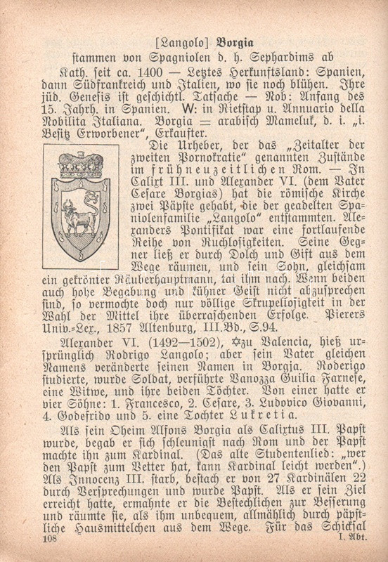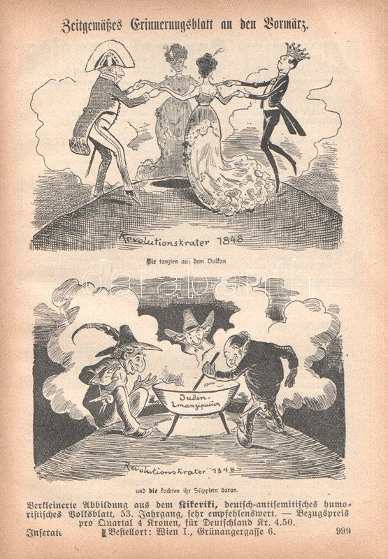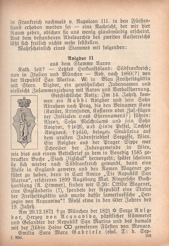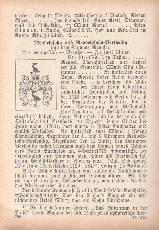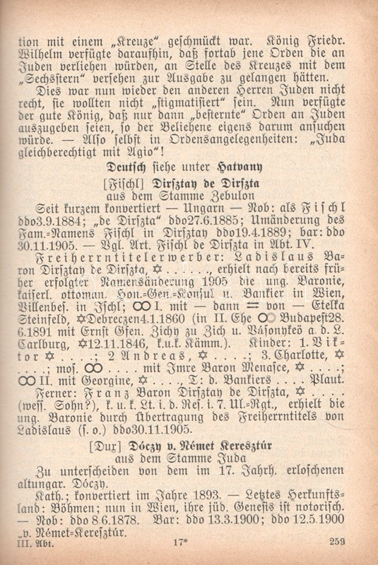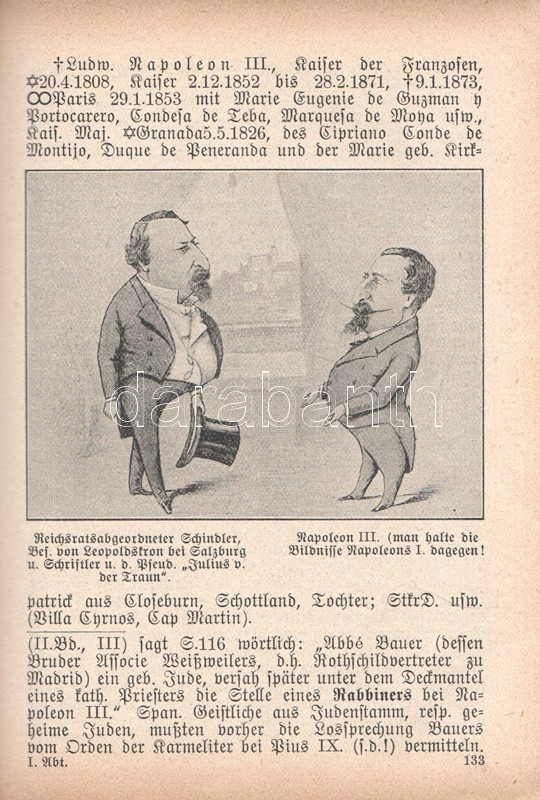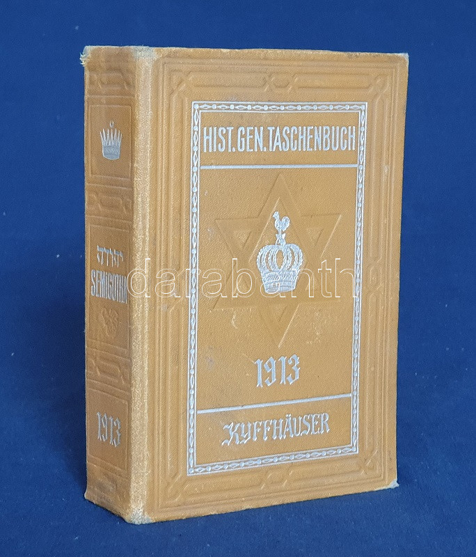 (Semigotha 1913.) Weimarer historisch-genealoges Taschenbuch des gesamten Adels jehudäischen Ursprunges. (Hebraici et conversi et de genere Juda). Zweiter Jahrgang, 1913. München, 1913. Kyffhäuser-Verlag (F. Bruckmann). 1 t. (címképen Benjamin Disraeli angol miniszterelnök mellképe) + 1009 + [3] p. A német nemességet számba vevő, 1764 óta megjelenő genealógiai évkönyv, a Gothai Almanach mintájára 1912-ben alapított Semigotha évkönyv célkitűzése a nemesi címet bármely országban elnyerő zsidó családok ismertetése. Német nyelvű nemzetközi évkönyvünk jelmagyarázata többnyelvű, tekintettel a különféle országokban nemesi címet elért zsidó családok történetét tanulmányozó reménybeli olvasók különféle anyanyelveire, így a német mellett a jelkulcs francia, angol, olasz és magyar nyelven is szerepel, benne a vegyes házasságok, illetve a zsidó vagy keresztény hitben való halálozás szimbólumával. A társadalomtörténeti, illetve szociálpszichológiai szempontból emlékezetes almanach-sorozat első, 1912. évi kötete a korabeli kritika szerint számos pontatlanságot tartalmazott, a magyar névanyag esetében különösen feltűnő tévedésekkel: a korábbi kötet a magyarosított nevű sváb családot, a Kremsner-Rákosi családot, nem különben a Khuen-Héderváryakat, a Zichyket, a Koháryakat is a zsidósághoz csatolta. Az egykorú kritika csökkenő számban, de 1913-as genealógiai évkönyvünkben is azonosít különös és kínos baklövéseket, ám a kötet ennek ellenére vélhetően betöltötte eredeti célját. Függelékben a zsidó származásúnak tartott pápák, kardinálisok és hadvezérek lajstromával. Példányunkból egy levél hiányzik. -- Hozzákötve: Stauff, Ph. Semi-Lexikon (Semi-Kürschner). Verzeichniss der Dichter, Künstler, jeden Faches, Gelehrten, Politiker, Kaufleute usw. jüdischer Rasse, jüdischen Blutes und jüdischer Versippung, den von 1750 bis 1913 in Deutschland tätig oder bekannt waren. [Berlin], 1913. Szerző (Hanseatische Druck- und Verlagsanstalt, Hamburg). 30 p. Az eredeti műben szereplő zsidó származásúnak tartott pápák, kardinálisok és hadvezérek lajstroma után hozzákötött dokumentumunkban a Németország elmúlt másfél évszázadában karriert befutott zsidó származású kiválóságok listája, írók, tudósok, művészek, politikusok, hírlapírók, egyetemi és színházi emberek katalógusa. Vaknyomásos, feliratozott, illusztrált kiadói egészvászon kötésben.