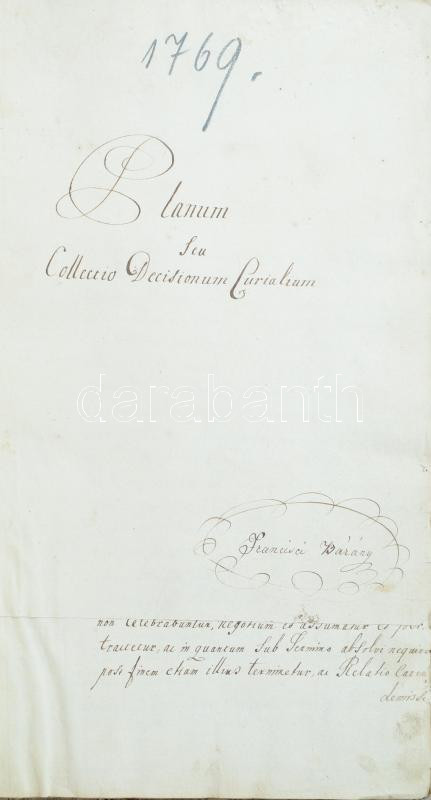 1769 Francisci Bárány: Planum seu Collectio Decisionum Curialum. Kézzel írt latin nyelvű jogi könyv, 2+V+1+86+II+209+1 p.+29 sztl. lev. Korabeli egészbőr-kötésben, kopott borítóval, sérült gerinccel, a táblákon sérülésekkel, a táblák vetemedettek, kissé foltos lapokkal, az elején két lap és a végén 4 lap kijár, néhány lapon kisebb sérüléssel.