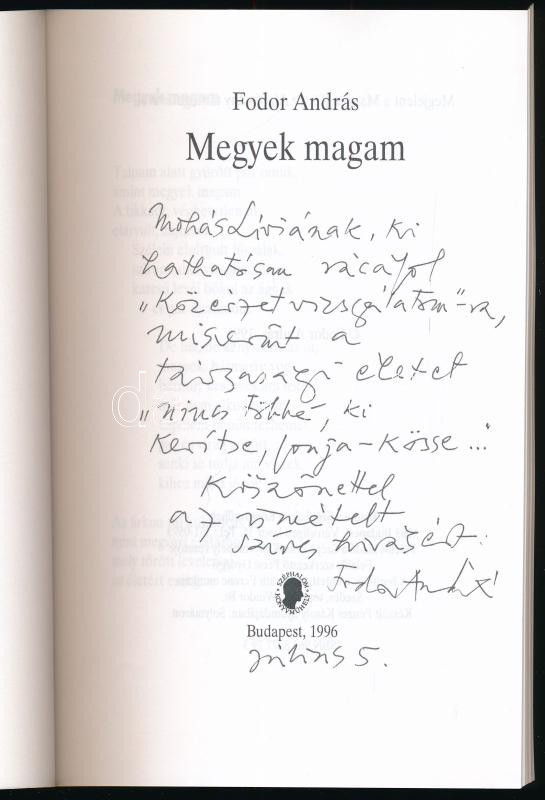 Fodor András: Megyek magam. A szerző, Fodor András (1929-1997) költő, esszéíró által Mohás Lívia (1928-2024) pszichológus, József Attila-díjas írónak DEDIKÁLT példány. Bp., 1996, Széphalom. Kiadói papírkötés.