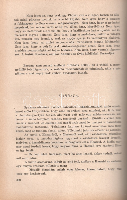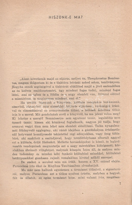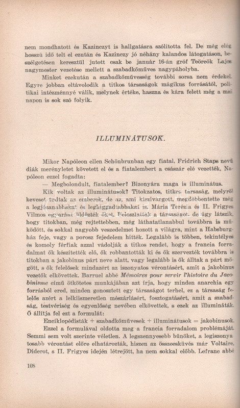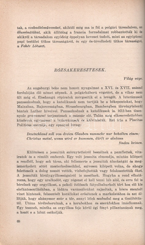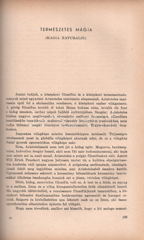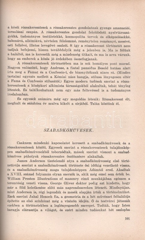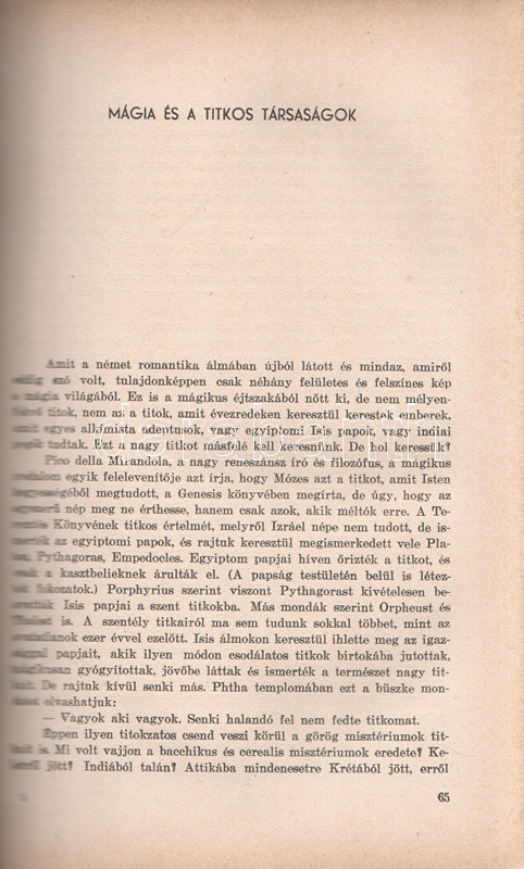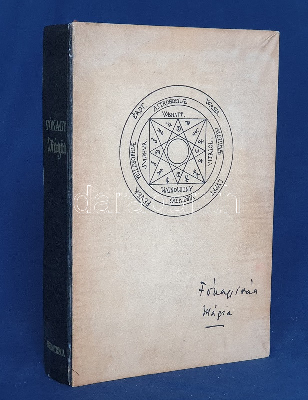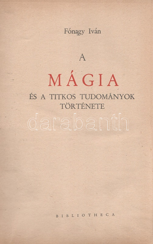 Fónagy Iván: A mágia és a titkos tudományok története. (Budapest, 1943). Bibliotheca (Antiqua Nyomdai és Irodalmi Rt.) 479 + [1] p. + 2 t. (kétoldalas). Első kiadás. Fónagy Iván (1920-2005) nyelvész, műfordító. Kultúrtörténeti áttekintésében a nyugati szellemhit és mágikus praktikák történetét vázolja, a szellemlátóktól a halottidézőkig, a mesmeri delejezőktől az alkimistákig és asztrológusokig. Hosszú fejezetben elemzi a három hírhedt, ellentmondásos megítélésű titkos társaság, a rózsakeresztesek, az illuminátusok és a szabadkőművesek történetét. Példányunk első ívének fűzése laza. Dömölki 1641. Aranyozott gerincű, illusztrált, keménytáblás, enyhén sérült kiadói félvászon kötésben. Jó példány.