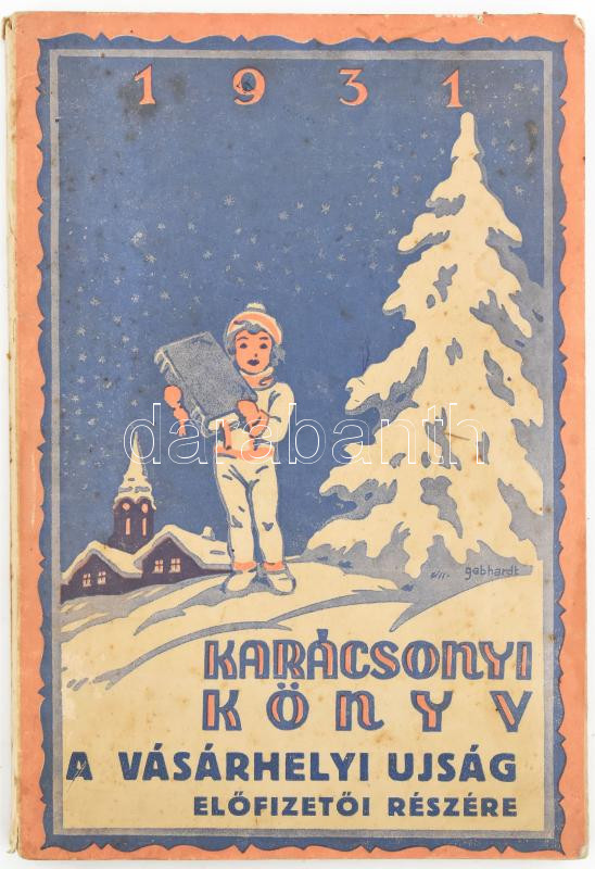 Description: Karácsonyi Könyv 1931. A Vásárhelyi Újság előfizetői részére. Benne naptárral, érdekes írásokkal, korabeli reklámokkal. A borítón Gönczi-Gebhardt Tibor grafikájával. Papírkötésben, kissé foltos borítóval és lapokkal, a gerincen kis szakadással.