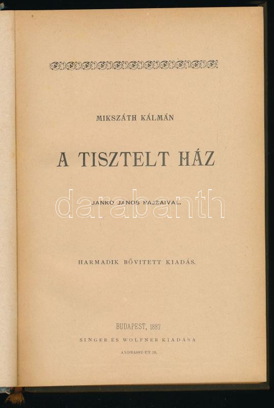 Mikszáth Kálmán: A tisztelt ház. Jankó János rajzaival. Bp., 1887, Sin... https://www.darabanth.com/en/468-Online-auction/468.0/Books/Books-Other-rarities~1500015/Mikszath-Kalman-A-tisztelt-haz-Janko-Janos-rajzaival-Bp-1887-Singer-es-Wolfner-189plus3-p~II3165193